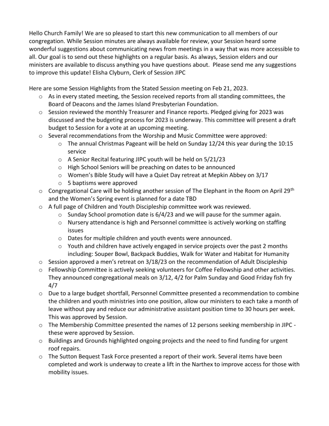 Our mission at James Island Presbyterian Church is to have Every Member in Ministry.